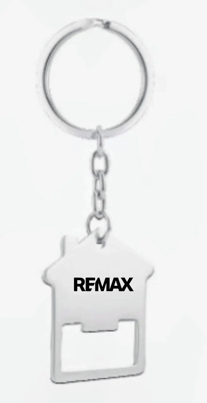 Llavero metálico en forma de casa con destapador integrado. Fabricado en metal resistente, combina funcionalidad y estilo, permitiendo abrir botellas fácilmente mientras mantiene las llaves seguras. Su diseño en forma de casa lo convierte en un detalle perfecto para REMAX, asesores inmobiliarios, constructoras y desarrolladores que buscan un obsequio útil y memorable.
