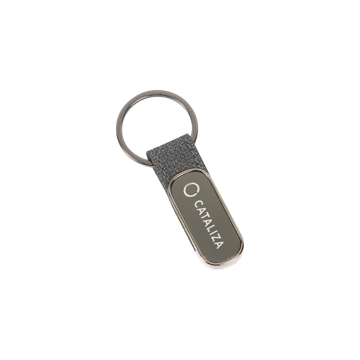 Llavero fabricado en metal y curpiel. Incluye un asa pequeña de curpiel y el arillo principal es fácil de manipular. Este diseño innovador incorpora elementos metálicos cromados, que añaden un toque de elegancia y durabilidad al llavero.